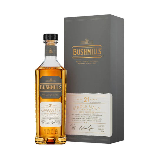 Bushmills 21 Year Old represents the pinnacle of Irish whiskey craftsmanship, aged for over two decades in carefully selected oak casks. This single malt delivers a sophisticated palate with notes of dried fruit, warm spice, and subtle oak, balanced by a creamy mouthfeel and lingering finish. The extended maturation process develops remarkable complexity and depth, making it an exceptional choice for discerning whiskey enthusiasts who appreciate refined character and heritage distilling. A distinguished addition to any collection.
